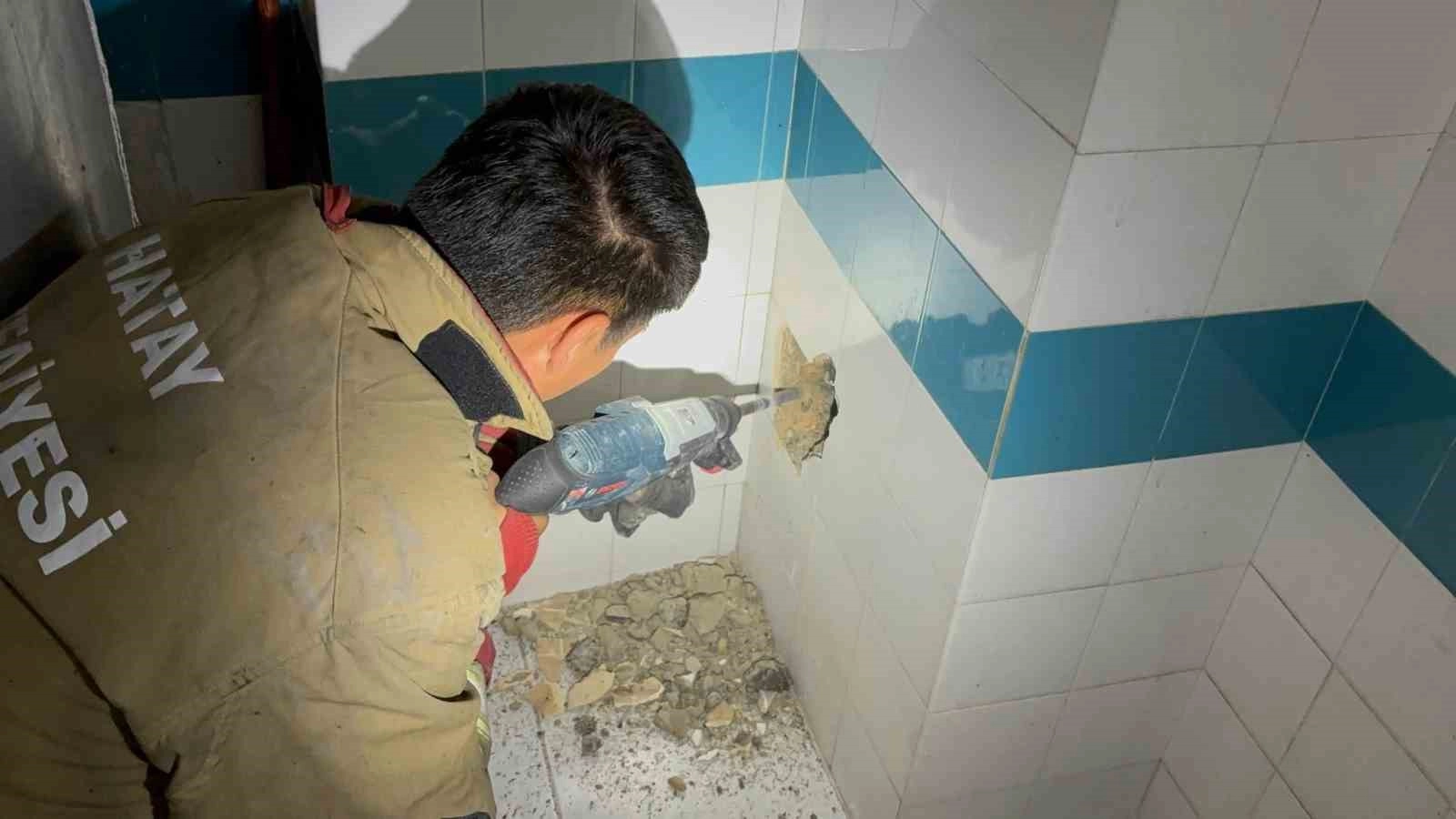 Hatay’da bacadan içeriye düşerek mahsur kalan yavru kedi, itfaiye ekiplerinin duvarda açtığı delikten kurtarıldı.